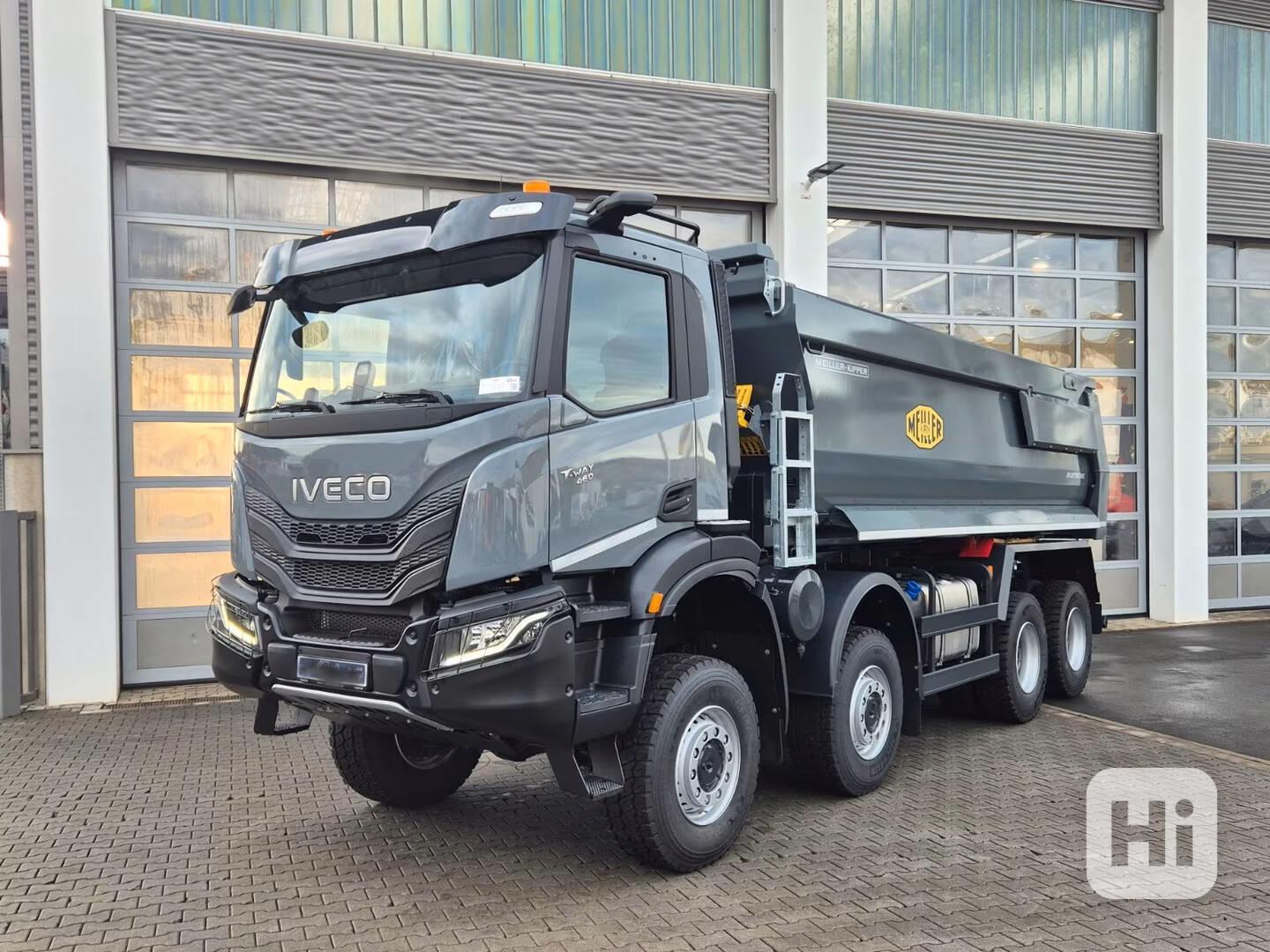 Prodám nové vozidlo IVECO AD410T46W + sklápěč Meiller S1, barva kabiny šedá, uspořádání podvozku 8x8, rozvor 4750 mm, převodovka TRAXON II - 12 rychlostní robotizovaná, výkon motoru 460 PS, emisní třída EURO VI E, tempomat, digitální tachograf, halogenové hlavní světlomety, digitální zpětná zrcátka, přední světlomety do mlhy s funkcí přisvětlování do zatáčky, klimatizace, luxusní textilní klimatizované sedadlo řidiče odpružené vzduchem, ochranné mřížky hlavních světlometů, 2 led majáky, ochranný štít chladiče a olejové vany, uzávěrka diferenciálu přední nápravy, vnější sluneční clona, funkce rocking mode pro vyproštění.